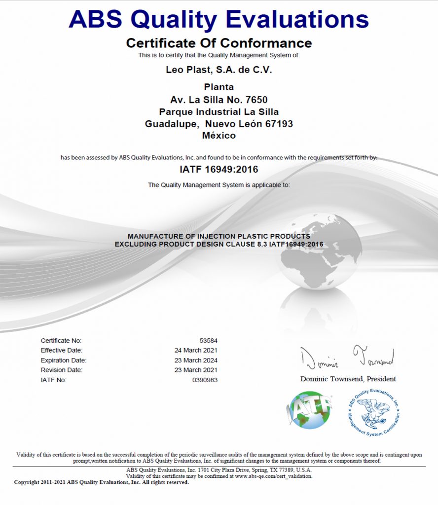 In Leoplast SA de CV we are dedicated to the manufacture of plastic parts through the injection process, offering quality products and services at competitive costs through qualified personnel, efficient use of equipment and timely deliveries. Committed to meet the needs, applicable legal and regulatory requirements of our stakeholders, and always seeking continuous improvement of the organization's processes.